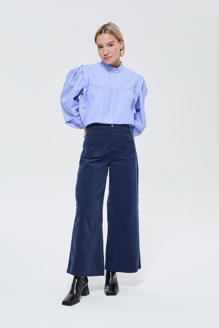 Le pantalon JOULIA Bleu Marine combine profondeur et élégance. Sa coupe courte évasée apporte une touche rétro chic parfaitement actuelle.
