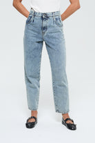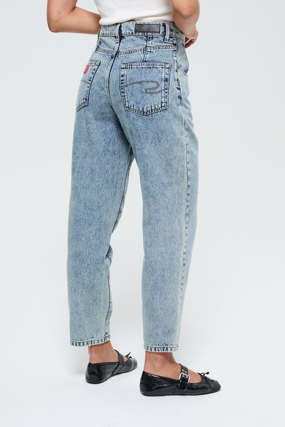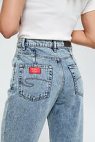 Women's mom jeans in 100% cotton, featuring a high waist and a tapered leg cut, for a perfect balance between retro style and modern comfort.