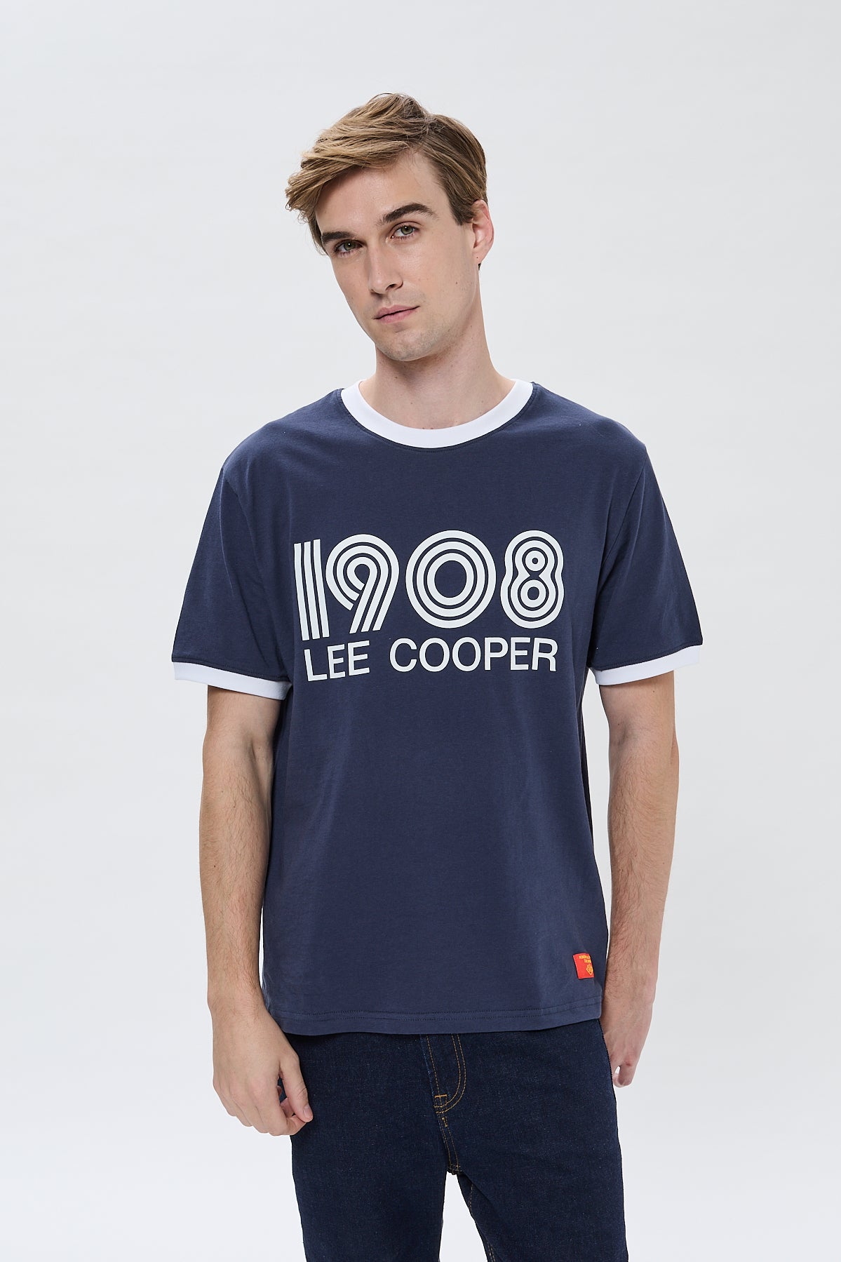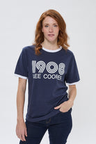 Featuring a crew neck and short sleeves highlighted with contrasting red details, it draws inspiration from the retro sports cuts that were emblematic of the era. On the chest, the inscription "1908 Lee Cooper" is presented in a vintage typography inspired by disco posters, a bold nod to the brand's historical roots.