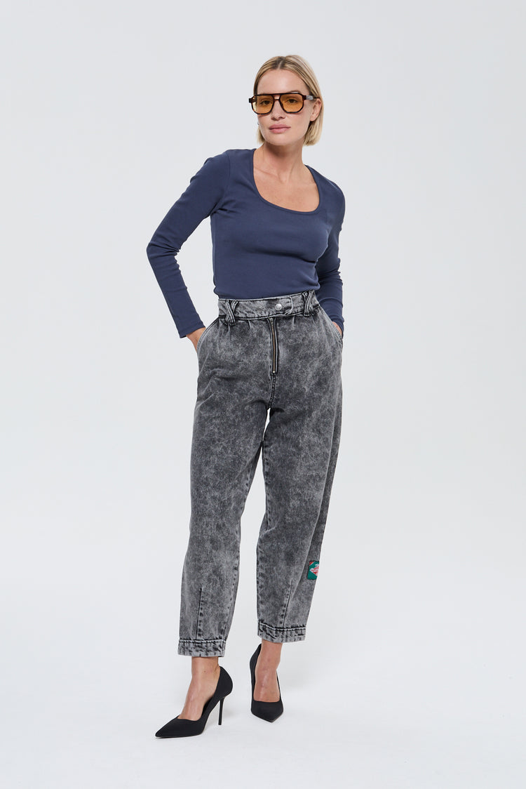 Jean mom pour femme en 100% Coton, caractérisé par une taille haute et une coupe fuselée au niveau des jambes, pour un équilibre parfait entre style rétro et confort moderne.
